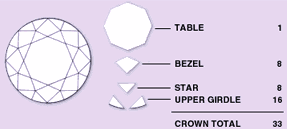 The table is the large flat facet on the top of a diamond. The table has a direct effect on the sparkle of a diamond. The size of the table in concert with the angle of the crown is responsible for the balance between brilliance--the flashes of white light bouncing back to the eye from within the diamond--and the play of colors created by refracted light as it prisms its way through a diamond's facets. The following are the ideal table percentages for various shapes of diamond: