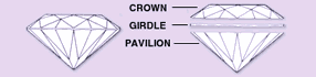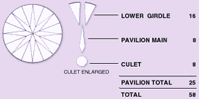 The facets on the bottom of a round brilliant cut diamond are called pavilion facets. When you look at a round brilliant cut diamond face-up the pavilion facets act as mirrors which reflect the image of the table--the large facet on the top of the diamond. This white table reflection seen within the center of the diamond indicates how beautiful and brilliant the diamond will be.